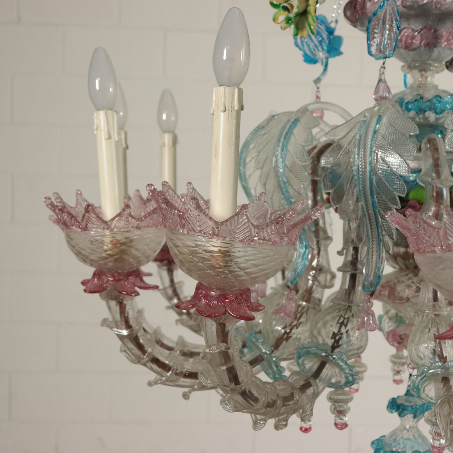 Asti AT 11 gen alle 2035. Un esempio molto bello e un po insolito di lampadario classico di Murano in stile veneziano in vetro chiaro con sei bracci per le luci. Bellissimo Lampadario Murano anni 50 multicolore chandelier 50s Lustre.